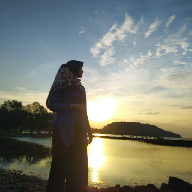 Gambar orang berhijab melihat sunset . Karuniakan untuk mereka syurga tanpa hisab.